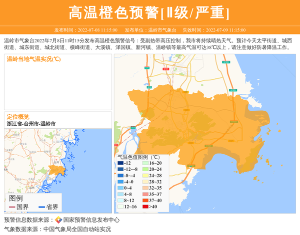 温岭市气象台2022年7月8日11时15分发布高温橙色预警信号:受副热带高压控制,我市将持续晴热天气。预计今天太平街道、城西街道、城东街道、城北街道、横峰街道、大溪镇、泽国镇、新河镇、温峤镇等最高气温可达38℃以上,请注意做好防暑降温工作。 信息来源:国家预警信息发布中心; 发布单位:温岭市气象台。