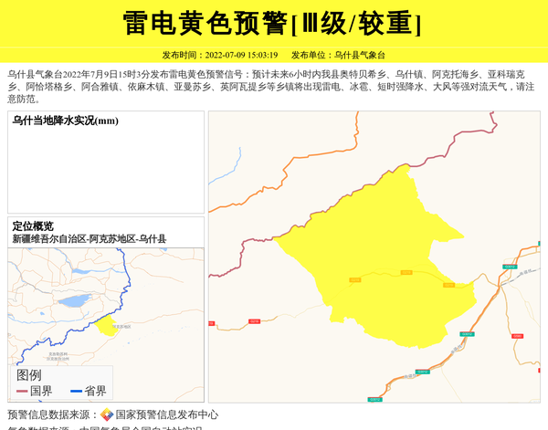 乌什县气象台发布雷电黄色预警[Ⅲ级/较重]
