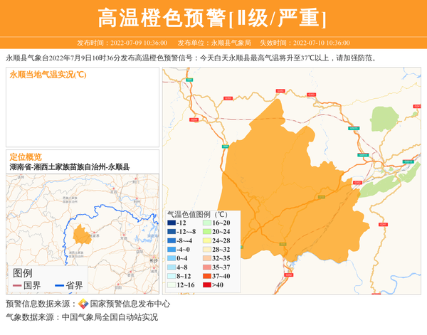 永顺县气象台2022年7月9日10时36分发布高温橙色预警信号:今天白天永顺县最高气温将升至37℃以上,请加强防范。 信息来源:国家预警信息发布中心; 发布单位:永顺县气象局。