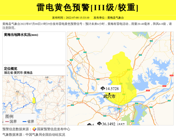 黄梅县气象台2022年07月08日15时29分发布雷电黄色预警信号:预计未来6小时,黄梅有雷电活动,雨量20-40毫米,阵风6-8级,请注意防范。 信息来源:国家预警信息发布中心; 发布单位:黄梅县气象台。