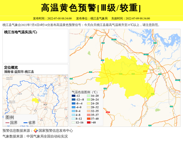 桃江县气象台2022年7月8日8时34分发布高温黄色预警信号:今天白天桃江县最高气温将升至35℃以上,请注意防范。 信息来源:国家预警信息发布中心; 发布单位:桃江县气象局。