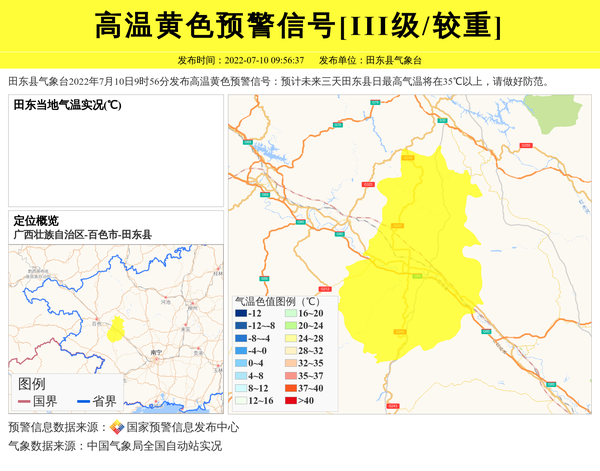 田东县气象台2022年7月10日9时56分发布高温黄色预警信号:预计未来三天田东县日最高气温将在35℃以上,请做好防范。 信息来源:国家预警信息发布中心; 发布单位:田东县气象台。
