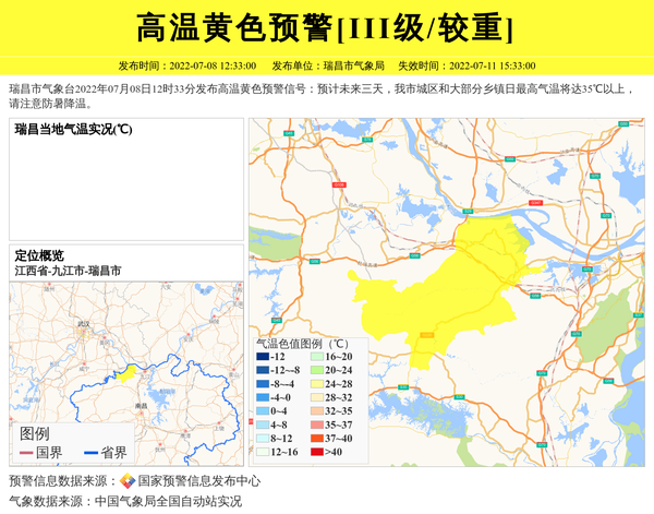 瑞昌市气象台2022年07月08日12时33分发布高温黄色预警信号:预计未来三天,我市城区和大部分乡镇日最高气温将达35℃以上,请注意防暑降温。 信息来源:国家预警信息发布中心; 发布单位:瑞昌市气象局。