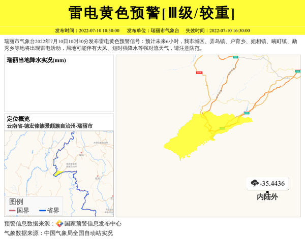 瑞丽市气象台2022年7月10日10时30分发布雷电黄色预警信号:预计未来6小时,我市城区、弄岛镇、户育乡、姐相镇、畹町镇、勐秀乡等地将出现雷电活动,局地可能伴有大风、短时强降水等强对流天气,请注意防范。 信息来源:国家预警信息发布中心; 发布单位:瑞丽市气象台。
