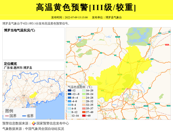 博罗县气象台于9日15时13分发布高温黄色预警信号。 信息来源:国家预警信息发布中心; 发布单位:博罗县气象台。