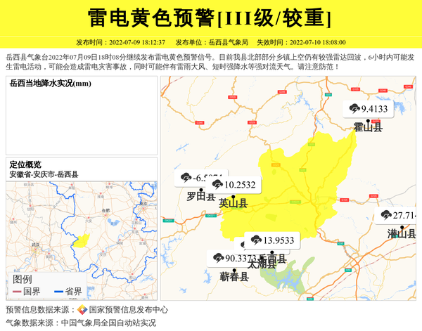 岳西县气象台2022年07月09日18时08分继续发布雷电黄色预警信号。目前我县北部部分乡镇上空仍有较强雷达回波,6小时内可能发生雷电活动,可能会造成雷电灾害事故,同时可能伴有雷雨大风、短时强降水等强对流天气。请注意防范! 信息来源:国家预警信息发布中心; 发布单位:岳西县气象局。