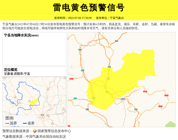 宁县气象台2022年07月08日17时38分发布雷电黄色预警信号:预计未来6小时内,我县盘克、湘乐、米桥、金村、九岘、春荣等乡镇部分地方可能发生雷电活动,局地可能伴有阵性大风和短时强降水等天气,请有关单位和人员做好防范。 信息来源:国家预警信息发布中心; 发布单位:宁县气象台。