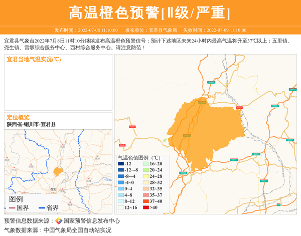 宜君县气象台2022年7月8日11时10分继续发布高温橙色预警信号:预计下述地区未来24小时内最高气温将升至37℃以上:五里镇、尧生镇、雷塬综合服务中心、西村综合服务中心。请注意防范! 信息来源:国家预警信息发布中心; 发布单位:宜君县气象局。