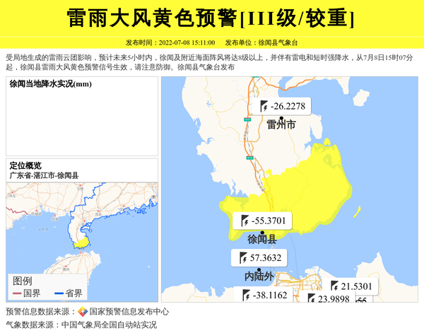受局地生成的雷雨云团影响,预计未来5小时内,徐闻及附近海面阵风将达8级以上,并伴有雷电和短时强降水,从7月8日15时07分起,徐闻县雷雨大风黄色预警信号生效,请注意防御。徐闻县气象台发布 信息来源:国家预警信息发布中心; 发布单位:徐闻县气象台。