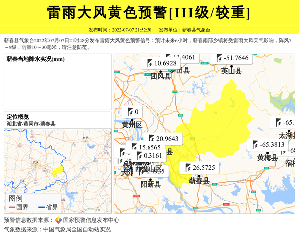 蕲春县气象台2022年07月07日21时48分发布雷雨大风黄色预警信号:预计未来6小时,蕲春南部乡镇将受雷雨大风天气影响,阵风7~9级,雨量10~30毫米,请注意防范。 信息来源:国家预警信息发布中心; 发布单位:蕲春县气象台。