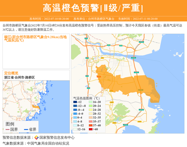 台州市路桥区气象台2022年7月10日8时20分发布高温橙色预警信号:受副热带高压控制,预计今天我区各镇(街道)最高气温可达38℃以上,请注意做好防暑降温工作。 信息来源:国家预警信息发布中心; 发布单位:台州市路桥区气象台。