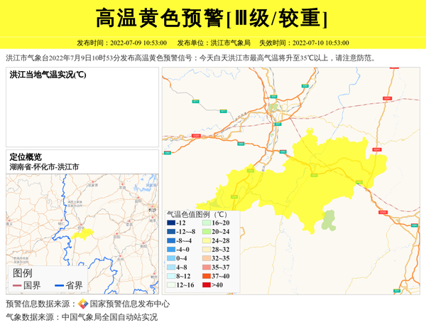 洪江市气象台2022年7月9日10时53分发布高温黄色预警信号:今天白天洪江市最高气温将升至35℃以上,请注意防范。 信息来源:国家预警信息发布中心; 发布单位:洪江市气象局。