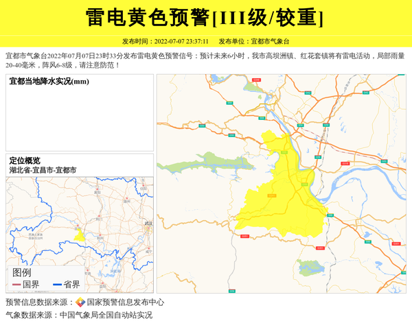宜都市气象台2022年07月07日23时33分发布雷电黄色预警信号:预计未来6小时,我市高坝洲镇、红花套镇将有雷电活动,局部雨量20-40毫米,阵风6-8级,请注意防范! 信息来源:国家预警信息发布中心; 发布单位:宜都市气象台。