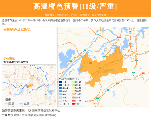 赤壁市气象台2022年07月09日11时05分发布高温橙色预警信号:预计今天午后,我市大部地区最高气温将升至37℃以上,请注意防范。 信息来源:国家预警信息发布中心; 发布单位:赤壁市气象台。