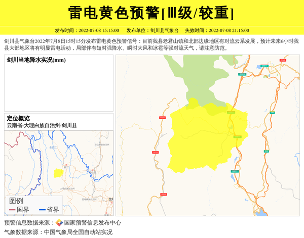 剑川县气象台2022年7月8日15时15分发布雷电黄色预警信号:目前我县老君山镇和北部边缘地区有对流云系发展,预计未来6小时我县大部地区将有明显雷电活动,局部伴有短时强降水、瞬时大风和冰雹等强对流天气,请注意防范。 信息来源:国家预警信息发布中心; 发布单位:剑川县气象台。