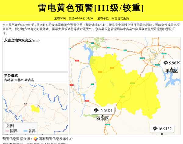 永吉县气象台2022年7月9日15时33分发布雷电黄色预警信号:预计未来6小时,我县有中等以上强度的雷电活动,可能会造成雷电灾害事故,部分地方伴有短时强降水、雷暴大风或冰雹等强对流天气,永吉县应急管理局与永吉县气象局联合提醒注意做好预防工作。 信息来源:国家预警信息发布中心; 发布单位:永吉县气象局。