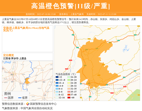 上栗县气象台2022年07月10日08时15分变更高温橙色预警信号:预计未来24小时内,赤山镇、东源乡、鸡冠山乡、金山镇、上栗镇、桐木镇、杨岐乡、长平乡的部分地区最高气温将达37°C以上,请注意防暑降温。 信息来源:国家预警信息发布中心; 发布单位:上栗县气象局。