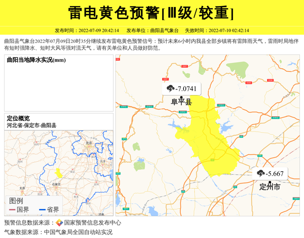 曲阳县气象台2022年07月09日20时35分继续发布雷电黄色预警信号:预计未来6小时内我县全部乡镇将有雷阵雨天气,雷雨时局地伴有短时强降水、短时大风等强对流天气,请有关单位和人员做好防范。 信息来源:国家预警信息发布中心; 发布单位:曲阳县气象台。