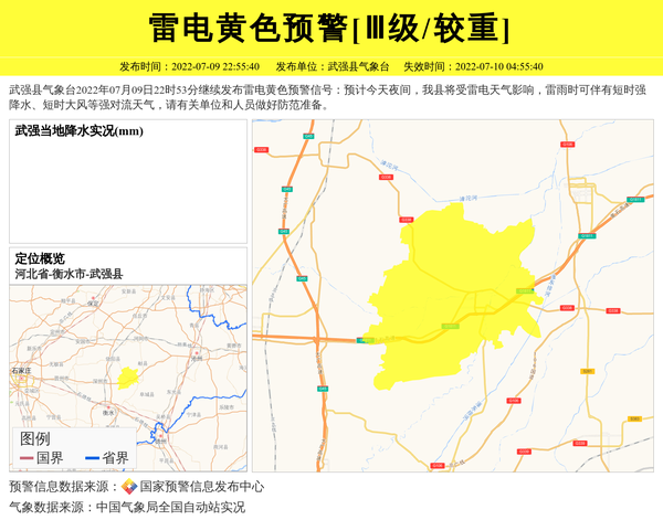 武强县气象台2022年07月09日22时53分继续发布雷电黄色预警信号:预计今天夜间,我县将受雷电天气影响,雷雨时可伴有短时强降水、短时大风等强对流天气,请有关单位和人员做好防范准备。 信息来源:国家预警信息发布中心; 发布单位:武强县气象台。