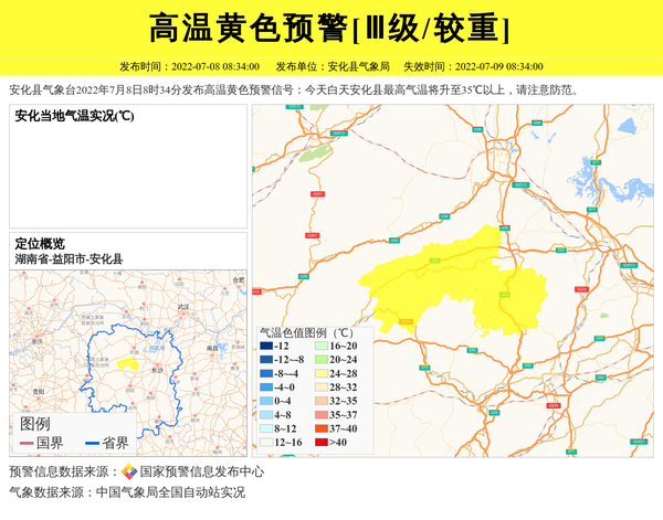 安化县气象台2022年7月8日8时34分发布高温黄色预警信号:今天白天安化县最高气温将升至35℃以上,请注意防范。 信息来源:国家预警信息发布中心; 发布单位:安化县气象局。