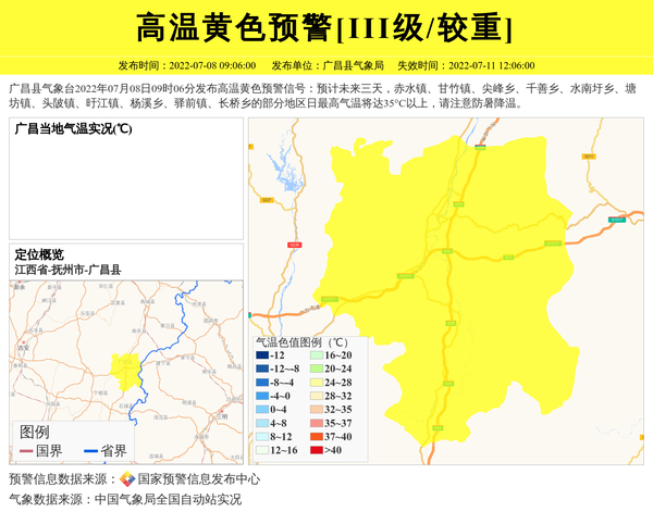 广昌县气象台2022年07月08日09时06分发布高温黄色预警信号:预计未来三天,赤水镇、甘竹镇、尖峰乡、千善乡、水南圩乡、塘坊镇、头陂镇、旴江镇、杨溪乡、驿前镇、长桥乡的部分地区日最高气温将达35°C以上,请注意防暑降温。 信息来源:国家预警信息发布中心; 发布单位:广昌县气象局。