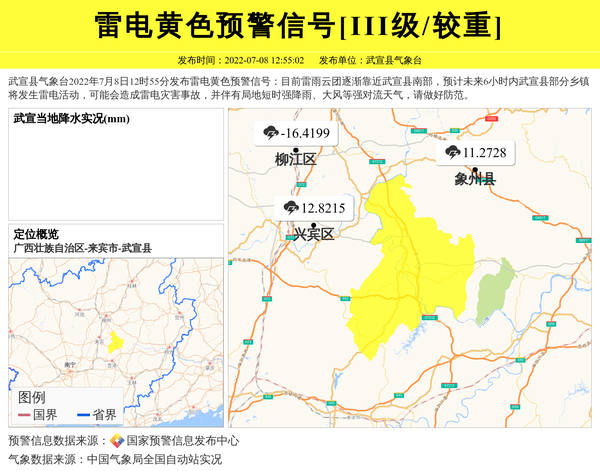 武宣县气象台2022年7月8日12时55分发布雷电黄色预警信号:目前雷雨云团逐渐靠近武宣县南部,预计未来6小时内武宣县部分乡镇将发生雷电活动,可能会造成雷电灾害事故,并伴有局地短时强降雨、大风等强对流天气,请做好防范。 信息来源:国家预警信息发布中心; 发布单位:武宣县气象台。