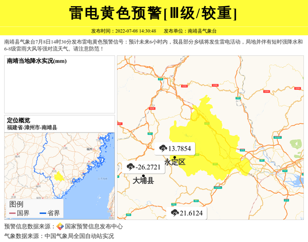 南靖县气象台7月8日14时30分发布雷电黄色预警信号:预计未来6小时内,我县部分乡镇将发生雷电活动,局地并伴有短时强降水和6-8级雷雨大风等强对流天气。请注意防范! 信息来源:国家预警信息发布中心; 发布单位:南靖县气象台。