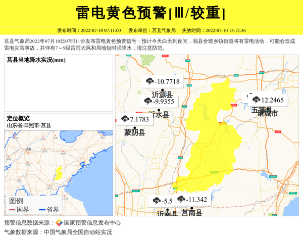 莒县气象局2022年07月10日07时11分发布雷电黄色预警信号:预计今天白天到夜间,我县全部乡镇街道将有雷电活动,可能会造成雷电灾害事故,并伴有7~9级雷雨大风和局地短时强降水,请注意防范。 信息来源:国家预警信息发布中心; 发布单位:莒县气象局。
