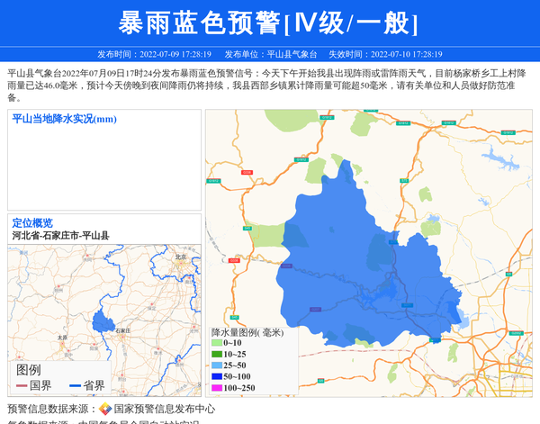 平山县气象台2022年07月09日17时24分发布暴雨蓝色预警信号:今天下午开始我县出现阵雨或雷阵雨天气,目前杨家桥乡工上村降雨量已达46.0毫米,预计今天傍晚到夜间降雨仍将持续,我县西部乡镇累计降雨量可能超50毫米,请有关单位和人员做好防范准备。 信息来源:国家预警信息发布中心; 发布单位:平山县气象台。