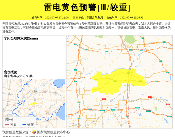 宁阳县气象局2022年7月9日17时22分发布雷电黄色预警信号:受对流回波影响,预计今天夜间到明天白天,我县大部分乡镇、街道将有雷电活动,可能会造成雷电灾害事故,过程中伴有7~9级的雷雨阵风和短时强降水。请做好防雷电、雷雨大风、短时强降水的准备工作。 信息来源:国家预警信息发布中心; 发布单位:宁阳县气象局。