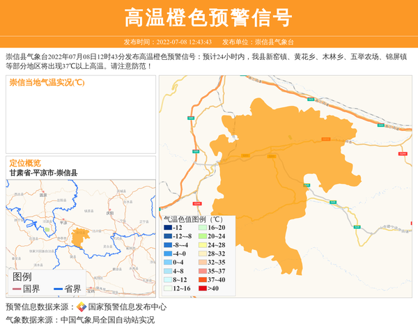 崇信县气象台2022年07月08日12时43分发布高温橙色预警信号:预计24小时内,我县新窑镇、黄花乡、木林乡、五举农场、锦屏镇等部分地区将出现37℃以上高温。请注意防范! 信息来源:国家预警信息发布中心; 发布单位:崇信县气象台。