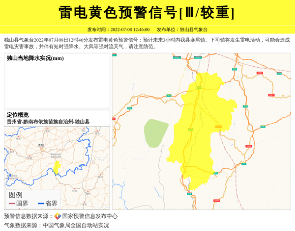 独山县气象台2022年07月08日12时46分发布雷电黄色预警信号:预计未来3小时内我县麻尾镇、下司镇将发生雷电活动,可能会造成雷电灾害事故,并伴有短时强降水、大风等强对流天气,请注意防范。 信息来源:国家预警信息发布中心; 发布单位:独山县气象台。