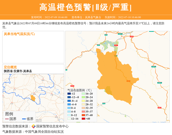 岚皋县气象台2022年07月09日10时46分继续发布高温橙色预警信号:预计我县未来24小时内最高气温将升至37℃以上,请注意防范。 信息来源:国家预警信息发布中心; 发布单位:岚皋县气象台。