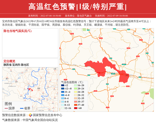 宝鸡市陈仓区气象台2022年07月08日10时50分升级发布高温红色预警信号:预计下述地区未来24小时内最高气温将升至40℃以上:东关街道、虢镇街道、千渭街道、阳平镇、周原镇、慕仪镇、钓渭镇、天王镇、磻溪镇、千河镇,请注意防范。 信息来源:国家预警信息发布中心; 发布单位:陈仓区气象台。