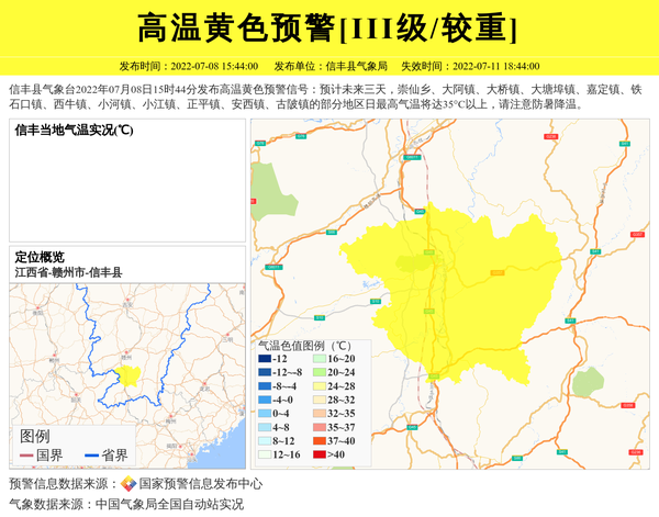 信丰县气象台2022年07月08日15时44分发布高温黄色预警信号:预计未来三天,崇仙乡、大阿镇、大桥镇、大塘埠镇、嘉定镇、铁石口镇、西牛镇、小河镇、小江镇、正平镇、安西镇、古陂镇的部分地区日最高气温将达35°C以上,请注意防暑降温。 信息来源:国家预警信息发布中心; 发布单位:信丰县气象局。