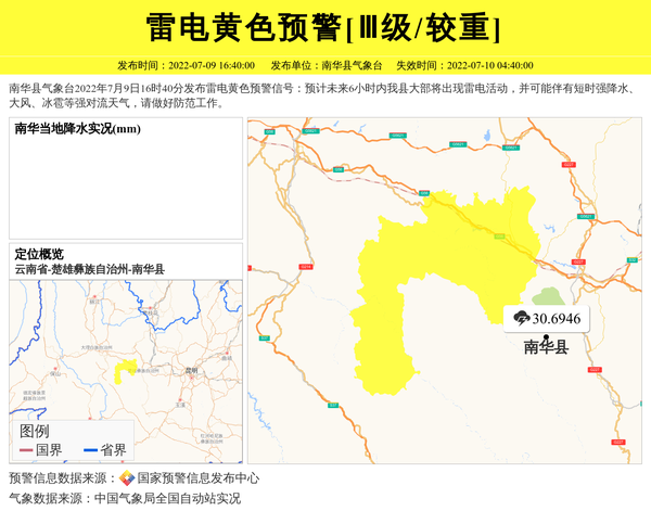 南华县气象台2022年7月9日16时40分发布雷电黄色预警信号:预计未来6小时内我县大部将出现雷电活动,并可能伴有短时强降水、大风、冰雹等强对流天气,请做好防范工作。 信息来源:国家预警信息发布中心; 发布单位:南华县气象台。