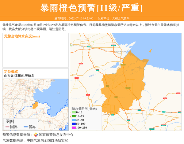无棣县气象局2022年07月10日09时25分发布暴雨橙色预警信号。目前我县柳堡镇降水量已达50毫米以上,预计今天白天降水仍将持续,我县大部分镇街将出现暴雨。请注意防范。 信息来源:国家预警信息发布中心; 发布单位:无棣县气象局。