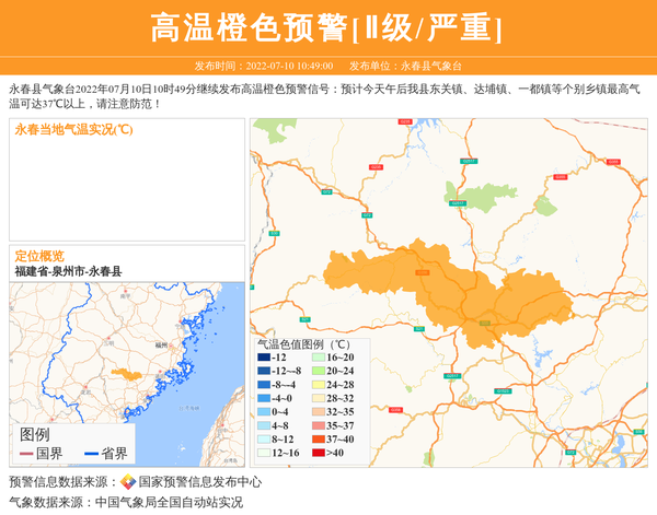 永春县气象台2022年07月10日10时49分继续发布高温橙色预警信号:预计今天午后我县东关镇、达埔镇、一都镇等个别乡镇最高气温可达37℃以上,请注意防范! 信息来源:国家预警信息发布中心; 发布单位:永春县气象台。