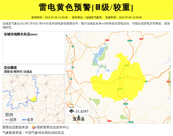 汝城县气象台2022年7月8日13时50分发布雷电黄色预警信号:预计汝城县未来6小时将发生雷电活动,可能出现雷电灾害事故,请加强防范。 信息来源:国家预警信息发布中心; 发布单位:汝城县气象局。