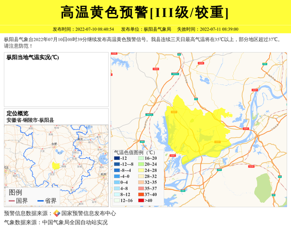 枞阳县气象台2022年07月10日08时39分继续发布高温黄色预警信号。我县连续三天日最高气温将在35℃以上,部分地区超过37℃。请注意防范! 信息来源:国家预警信息发布中心; 发布单位:枞阳县气象局。