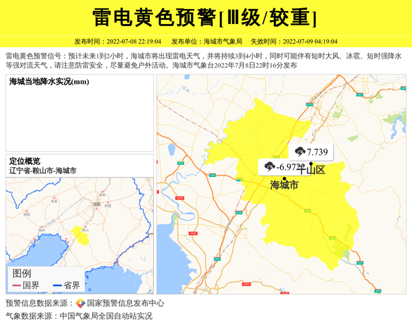 雷电黄色预警信号:预计未来1到2小时,海城市将出现雷电天气,并将持续3到4小时,同时可能伴有短时大风、冰雹、短时强降水等强对流天气,请注意防雷安全,尽量避免户外活动。海城市气象台2022年7月8日22时16分发布 信息来源:国家预警信息发布中心; 发布单位:海城市气象局。