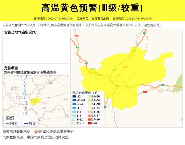 吉首市气象台2022年7月10日9时5分发布高温黄色预警信号:今天白天吉首市最高气温将升至35℃以上,请注意防范。 信息来源:国家预警信息发布中心; 发布单位:吉首市气象局。