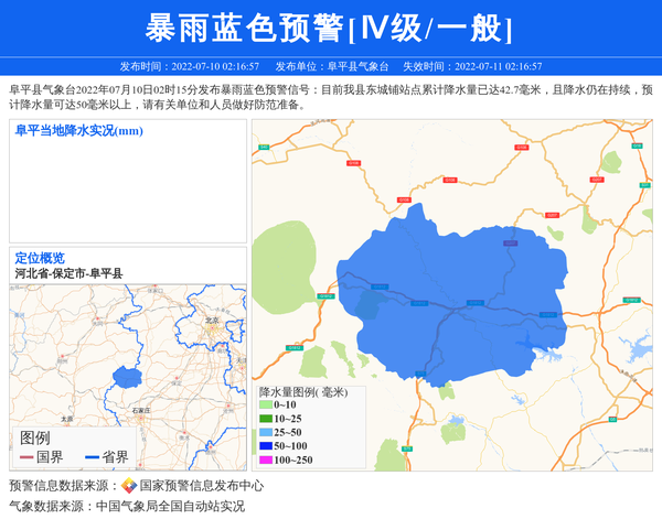 阜平县气象台2022年07月10日02时15分发布暴雨蓝色预警信号:目前我县东城铺站点累计降水量已达42.7毫米,且降水仍在持续,预计降水量可达50毫米以上,请有关单位和人员做好防范准备。 信息来源:国家预警信息发布中心; 发布单位:阜平县气象台。