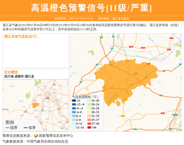 蒲江县气象台2022年07月08日09时35分对2022年07月05日10时20分发布的高温橙色预警信号进行第3次确认:蒲江县所有镇(街道)未来24小时内最高气温将升至35℃以上,其中高温时段在12-18时之间。 信息来源:国家预警信息发布中心; 发布单位:蒲江县气象台。