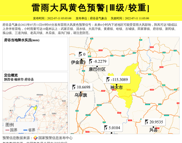 府谷县气象台2022年07月11日05时05分发布雷雨大风黄色预警信号:未来6小时内下述地区可能受雷雨大风影响,阵风可达7级或以上并伴有雷电,小时雨量可达10毫米以上:武家庄镇、清水镇、大昌汗镇、黄甫镇、哈镇、古城镇、田家寨镇、府谷镇、新民镇、孤山镇、三道沟镇、老高川镇、木瓜镇、庙沟门镇,请注意防范。 信息来源:国家预警信息发布中心; 发布单位:府谷县气象台。