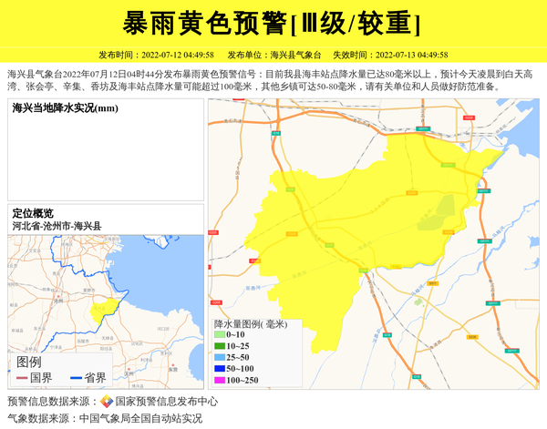 海兴县气象台2022年07月12日04时44分发布暴雨黄色预警信号:目前我县海丰站点降水量已达80毫米以上,预计今天凌晨到白天高湾、张会亭、辛集、香坊及海丰站点降水量可能超过100毫米,其他乡镇可达50-80毫米,请有关单位和人员做好防范准备。 信息来源:国家预警信息发布中心; 发布单位:海兴县气象台。