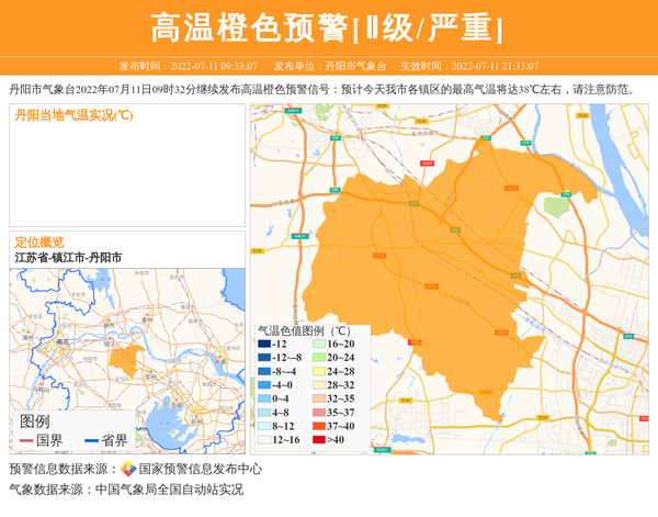 丹阳市气象台2022年07月11日09时32分继续发布高温橙色预警信号:预计今天我市各镇区的最高气温将达38℃左右,请注意防范。 信息来源:国家预警信息发布中心; 发布单位:丹阳市气象台。