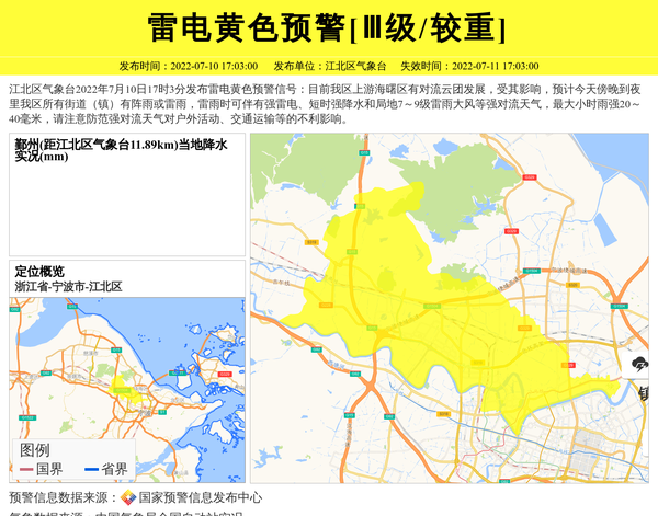 江北区气象台2022年7月10日17时3分发布雷电黄色预警信号:目前我区上游海曙区有对流云团发展,受其影响,预计今天傍晚到夜里我区所有街道(镇)有阵雨或雷雨,雷雨时可伴有强雷电、短时强降水和局地7~9级雷雨大风等强对流天气,最大小时雨强20~40毫米,请注意防范强对流天气对户外活动、交通运输等的不利影响。 信息来源:国家预警信息发布中心; 发布单位:江北区气象台。