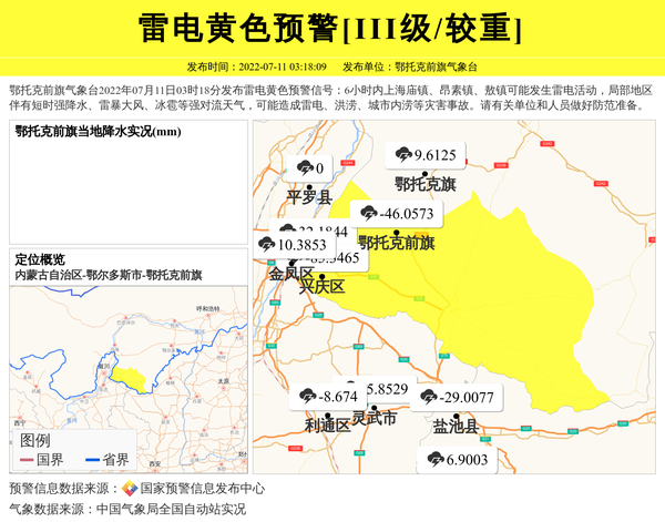 鄂托克前旗气象台2022年07月11日03时18分发布雷电黄色预警信号:6小时内上海庙镇、昂素镇、敖镇可能发生雷电活动,局部地区伴有短时强降水、雷暴大风、冰雹等强对流天气,可能造成雷电、洪涝、城市内涝等灾害事故。请有关单位和人员做好防范准备。 信息来源:国家预警信息发布中心; 发布单位:鄂托克前旗气象台。