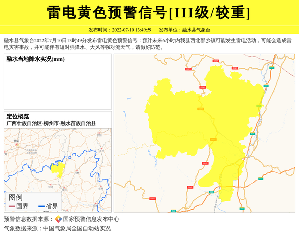 融水县气象台2022年7月10日13时49分发布雷电黄色预警信号:预计未来6小时内我县西北部乡镇可能发生雷电活动,可能会造成雷电灾害事故,并可能伴有短时强降水、大风等强对流天气,请做好防范。 信息来源:国家预警信息发布中心; 发布单位:融水县气象台。